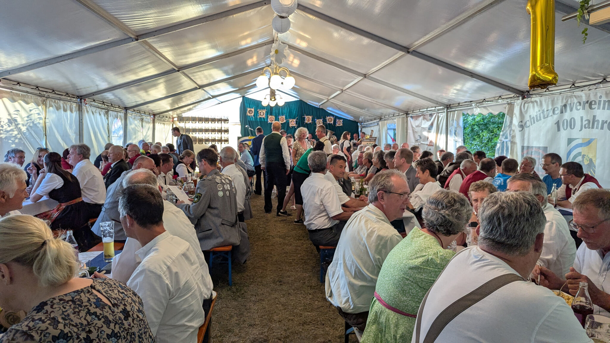 In dem mit viel Liebe zu Detail geschmückten und dekorierten Zelt begrüßte Anton Hildebrand in seiner Funktion als 1. Vorstand rund 200 geladene Gäste, darunter den Bürgermeister von Argenbühl, Roland Sauter, Mitglieder der Vereine des Schützenkreises Wangen und des eigenen Vereins und auch die zahlreichen fleißigen Helfer, die mit ihren leuchtend grünen T-Shirts überall in Aktion waren.